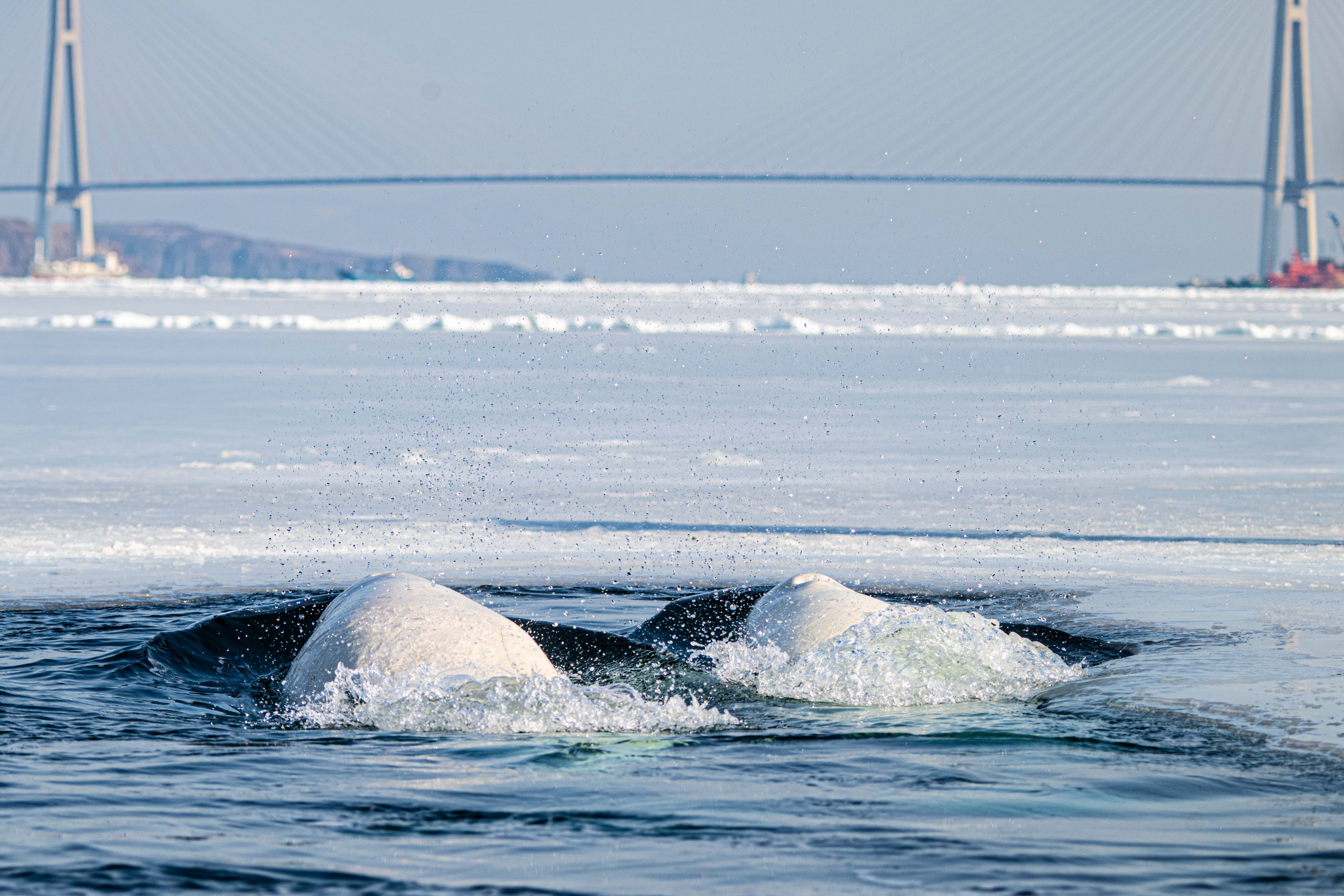 루스키 대교를 배경으로 잠쉬 숨을 쉬러 올라온 벨루가를 촬영할 수 있었다.