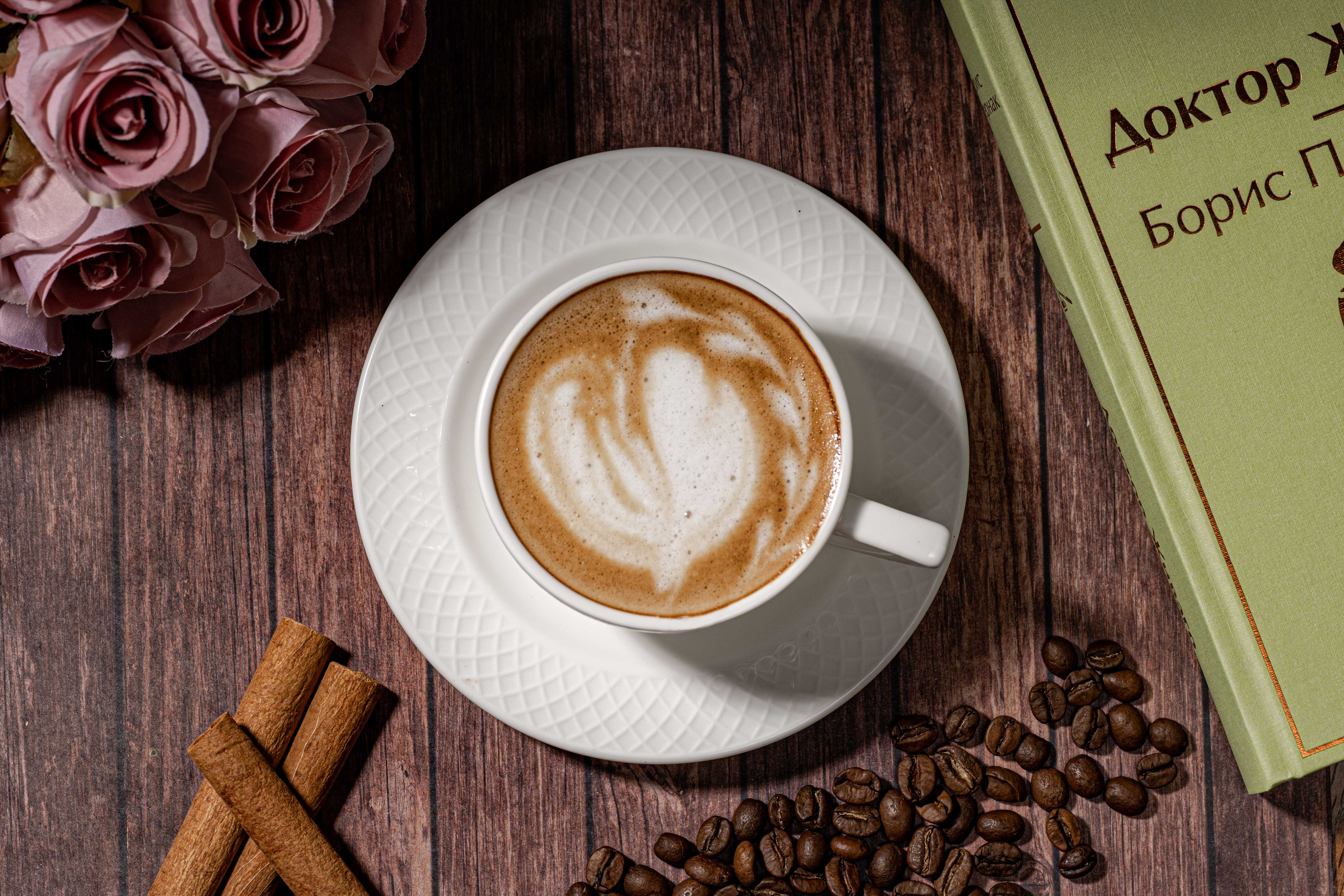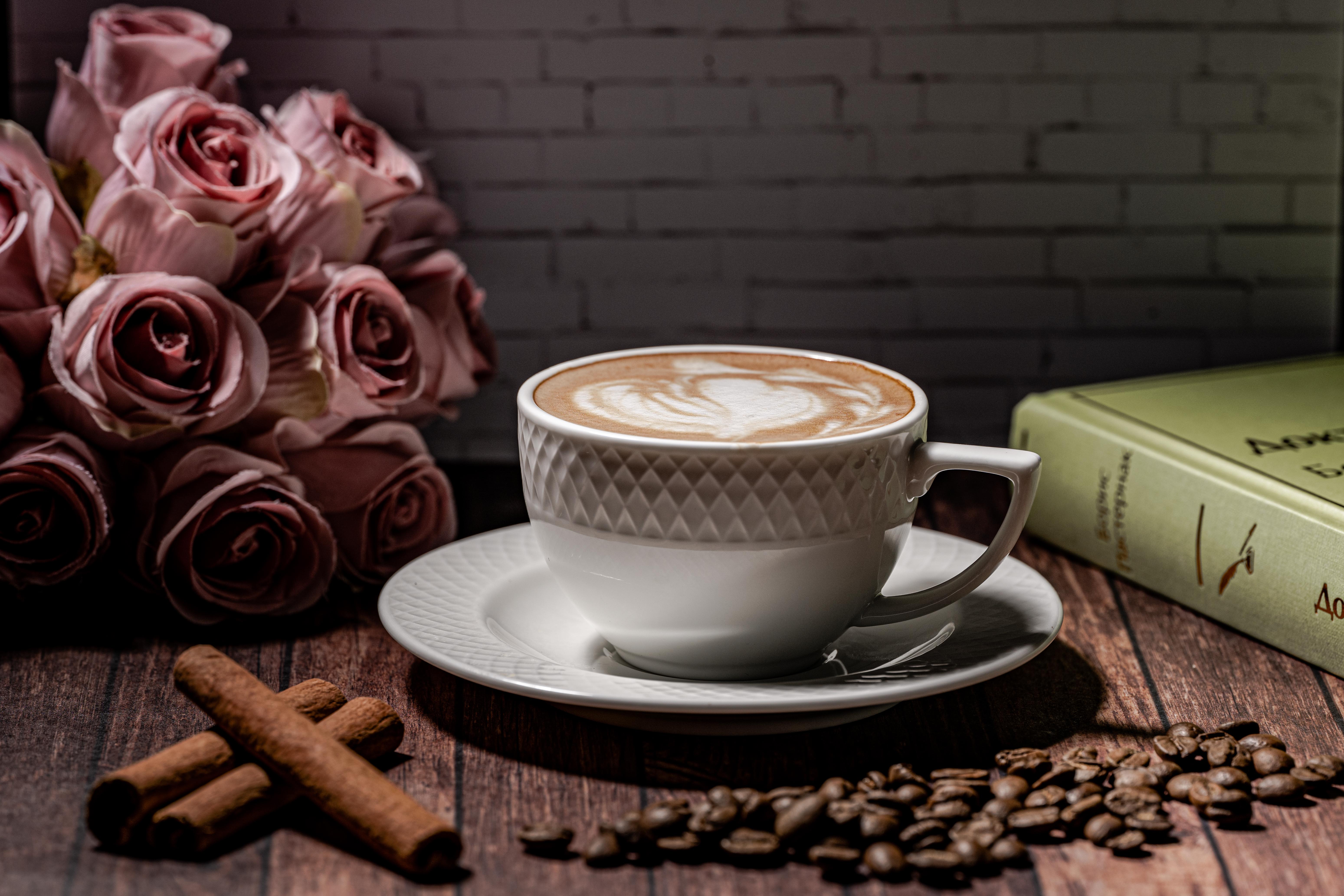 커피만 찍기에는 심심할 것 같아 배경에 구매한 시나본과, 장미 조화, 커피 원두를 세팅해 보았다